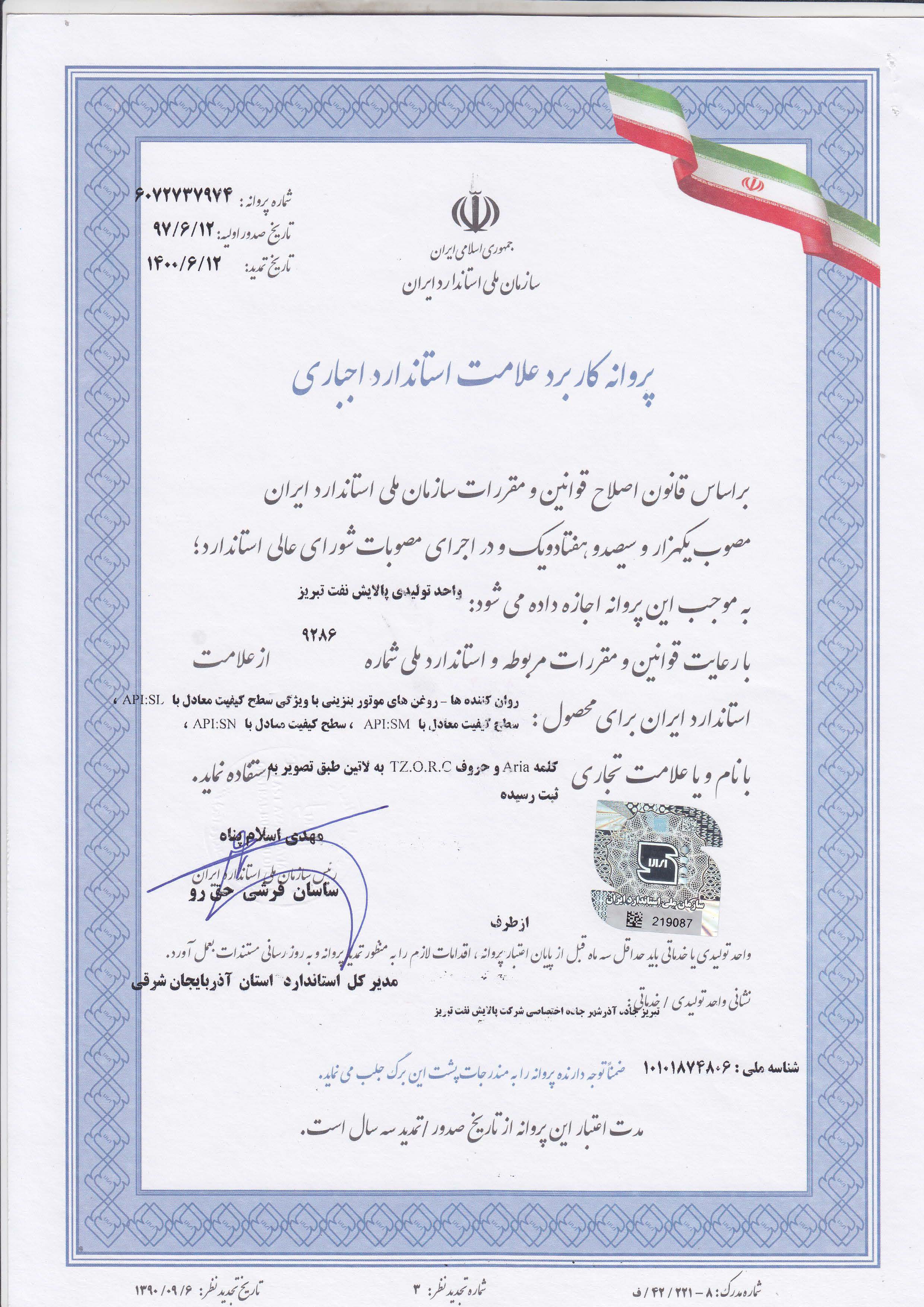 پروانه استاندارد محصولات